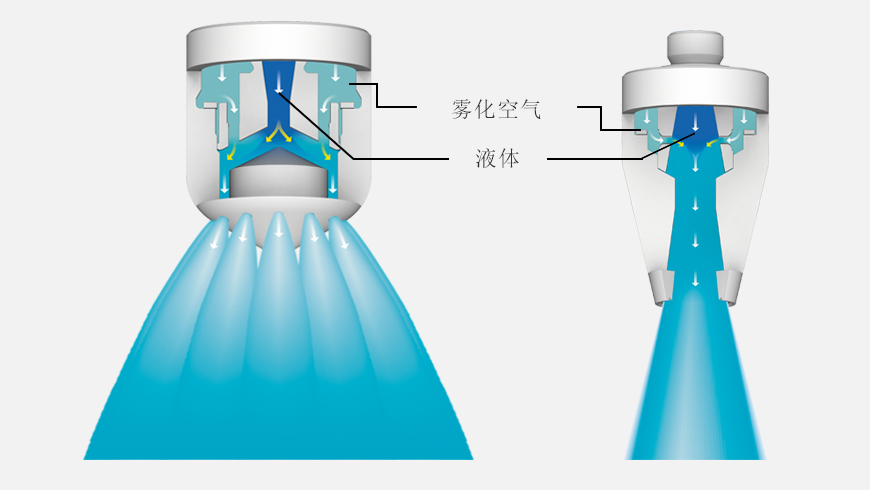 二流体喷嘴通过高压气体(如压缩空气或氮气)与液体在喷嘴出口处混合,利用高速气流对液体的剪切与冲击作用,将液体破碎成微小液滴。常见结构为同轴设计,即气体在外层、液体在内层,两相在外部或内部混合后喷出,形成均匀细雾。